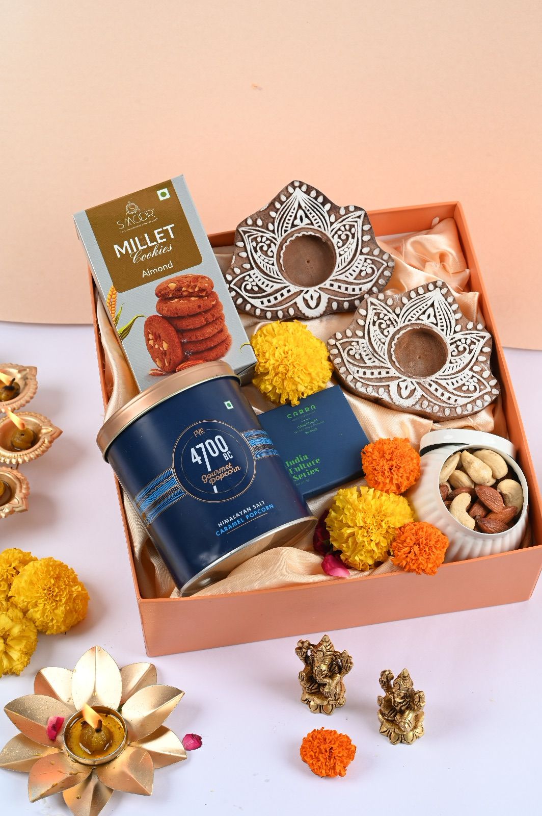 Includes Smoor Almond Millet Cookies, 4700 BC Himalayan Salt Caramel Popcorn, and Mixed Dry Fruits, offering a premium gifting experience.