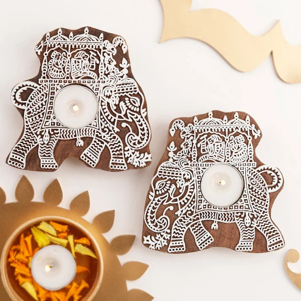Beautifully crafted wooden elephant-shaped candle holders, each accompanied by a tea light candle, adding charm to any Diwali decor.