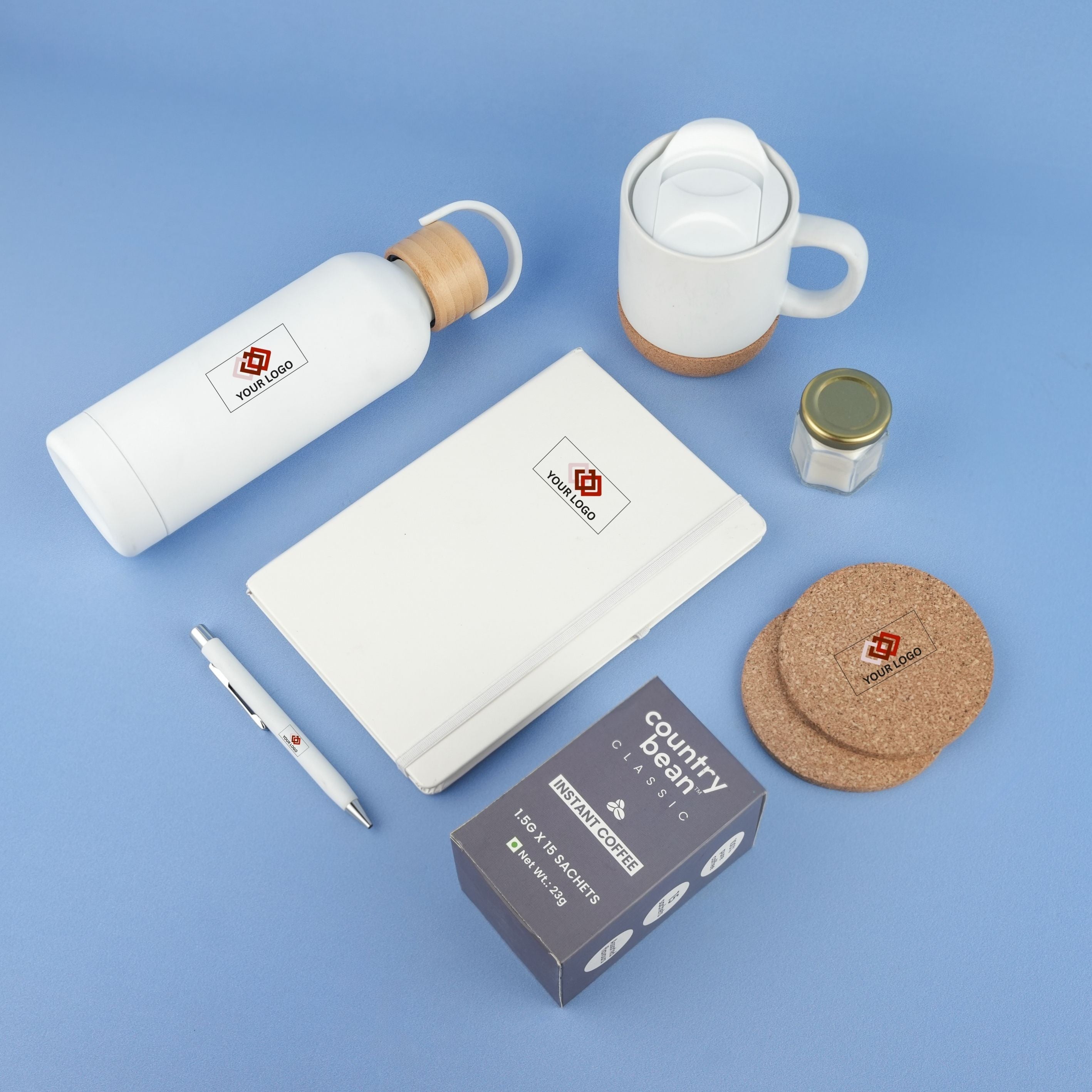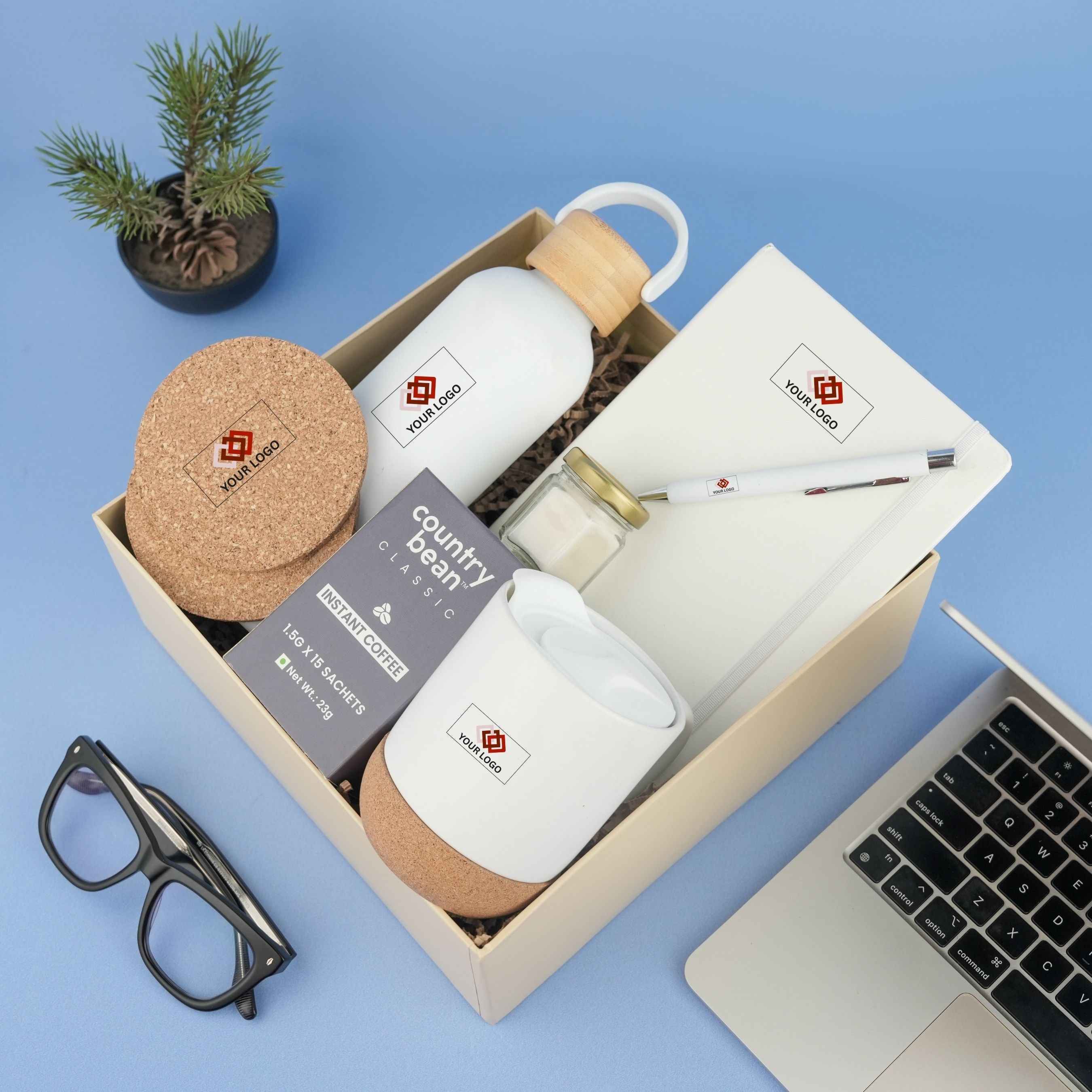 Combining productivity tools with relaxation and lifestyle elements, this hamper enhances everyday work experiences while maintaining a sophisticated and cohesive look. Each product can be custom branded with your company logo, making it a perfect choice for HR onboarding programs, corporate events, and client appreciation gifting.