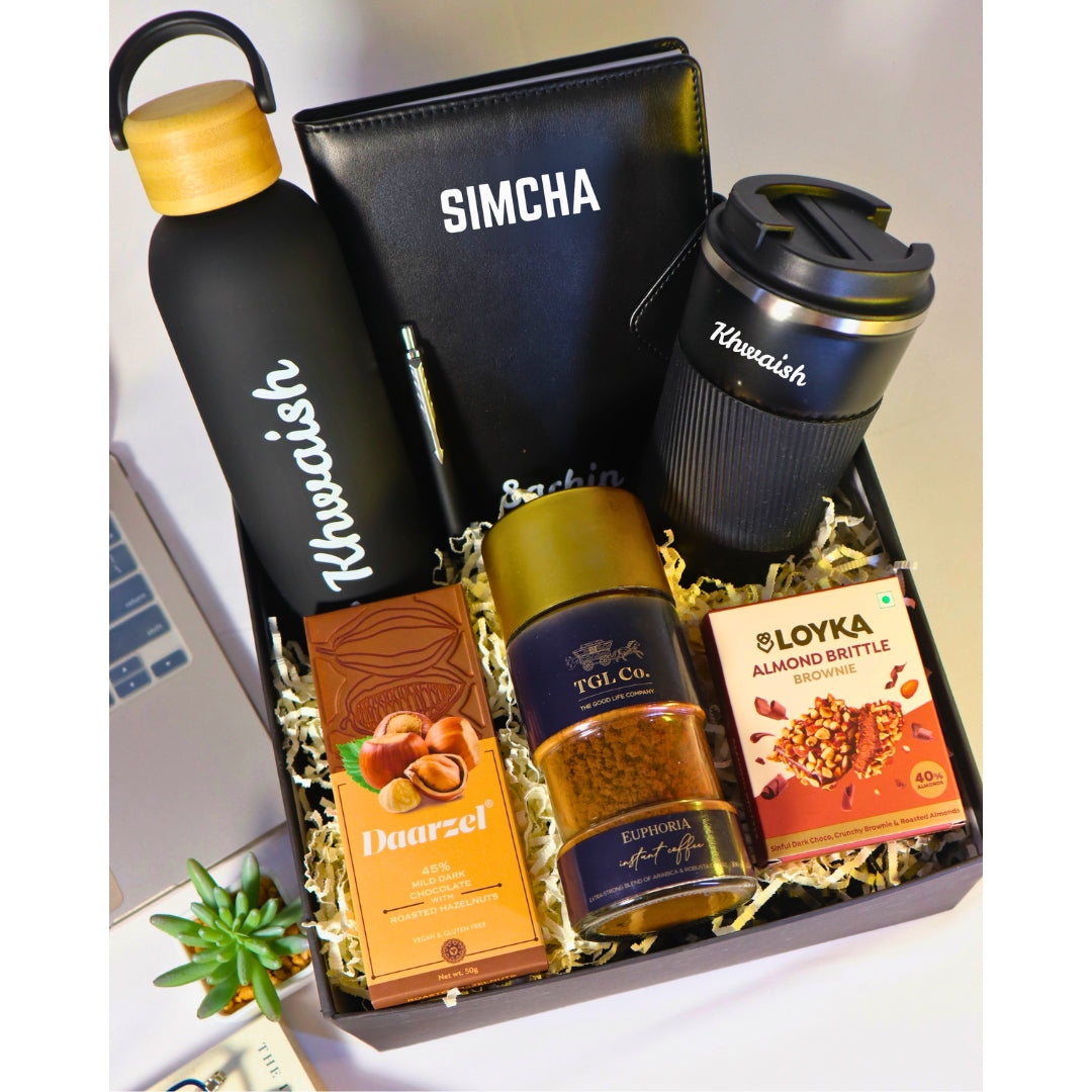 Welcome new team members in style with the Essentials Welcome Kit, a thoughtfully curated, premium employee joining hamper designed to reflect your company’s values of care, quality, and professionalism. Packed in a, sturdy 10x10x4 inch kappa reusable box, this black-themed luxury onboarding kit is both practical and elegant, making it the perfect companion for any modern professional.
