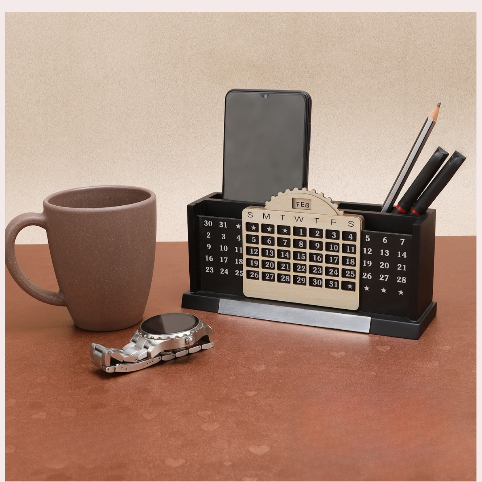 Enhance your workspace with this premium wooden desk organizer featuring a built-in perpetual calendar. Crafted from high-quality wood in a rich dark brown finish, this elegant desk accessory is designed for professionals who value functionality, organization, and style.