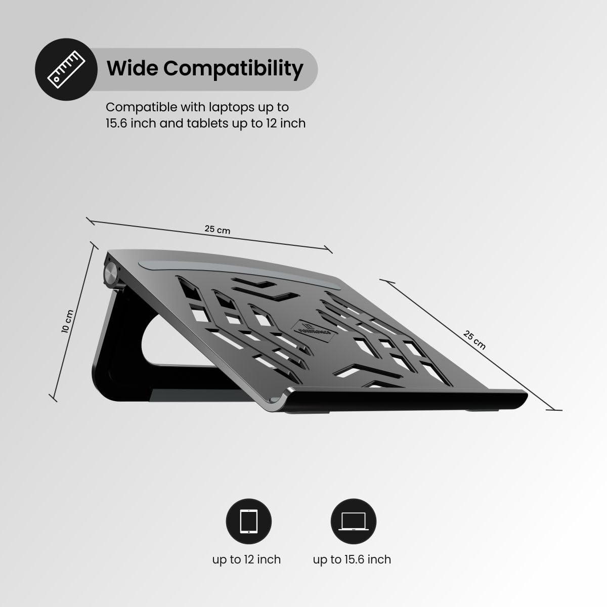Elevate your laptop screen to eye level with this ergonomic stand, reducing neck and back strain while improving your overall posture for a more comfortable working experience. Its foldable design enhances portability, making it easy to store when not in use. The ventilated structure promotes efficient heat dissipation, keeping your laptop cool during extended sessions, which is crucial for performance and longevity. Equipped with anti-slip silicon pads, the stand securely holds notebooks, preventing sliding and scratching for added stability and protection. Constructed from lightweight ABS plastic, it’s a convenient accessory for on-the-go use. Designed to accommodate laptops and MacBooks up to 15.6 inches, this sleek black stand enhances both your workspace and productivity. Transform your work setup with this stylish and functional laptop stand!