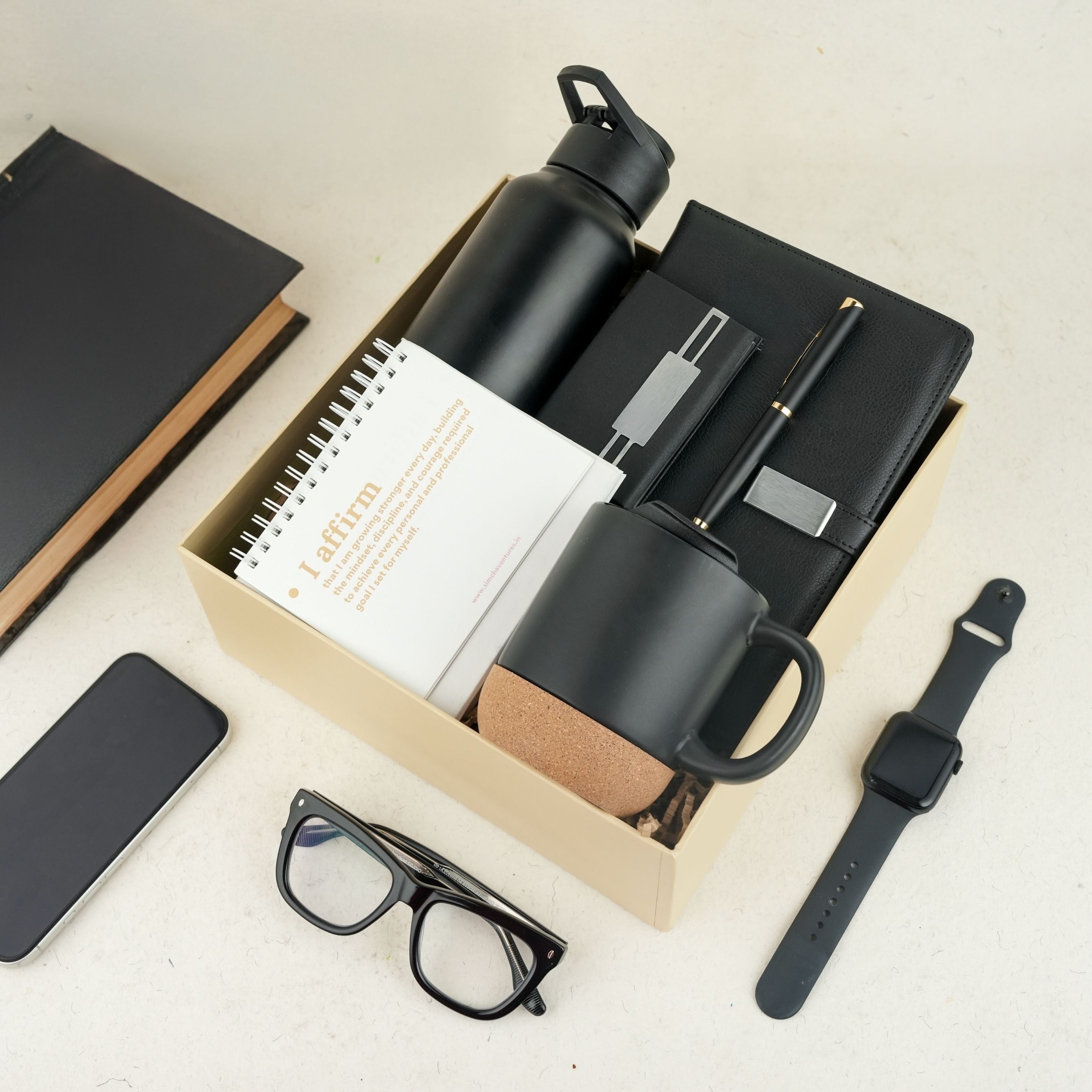 The Onyx Work Essentials Kit is a sleek and premium corporate gifting solution designed for modern workplaces that appreciate minimalism, functionality, and bold aesthetics. Curated in an all-black theme, this hamper brings together professional desk essentials and lifestyle products, making it an ideal choice for employee onboarding kits, corporate welcome hampers, and executive gifting.